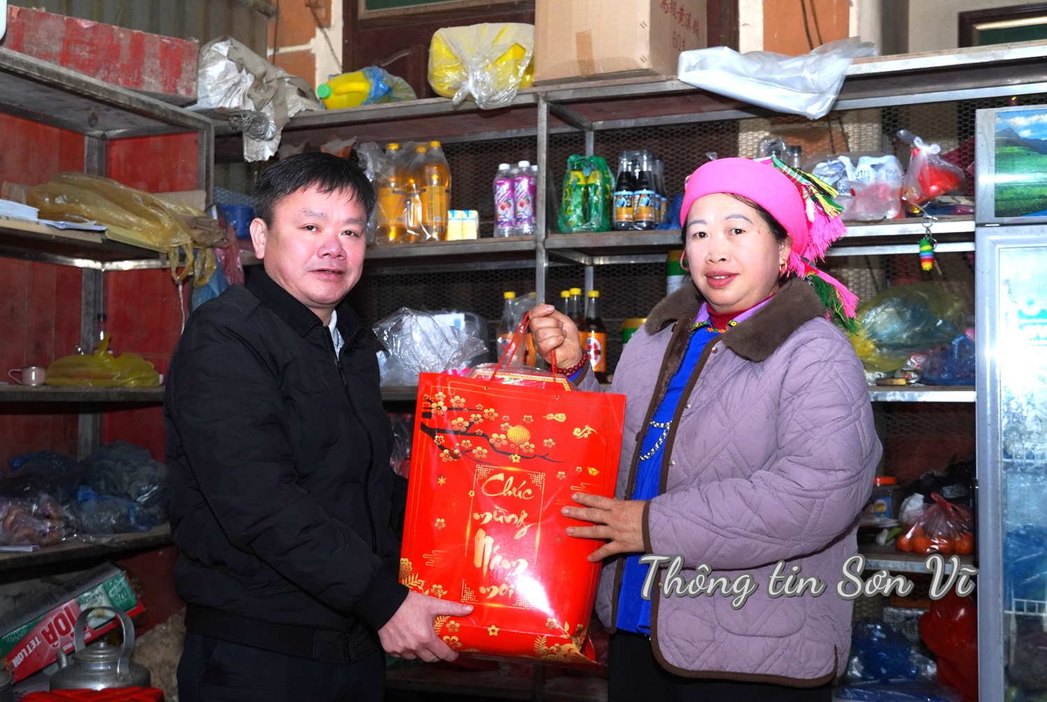 Đồng chí Nguyễn Huy Sắc, Bí thư Đảng ủy, Chủ tịch HĐND xã Sơn Vĩ (Tuyên Quang) trao quà Tết tặng bà Lù Thị Dâu, nguyên lãnh đạo xã Sơn Vĩ.